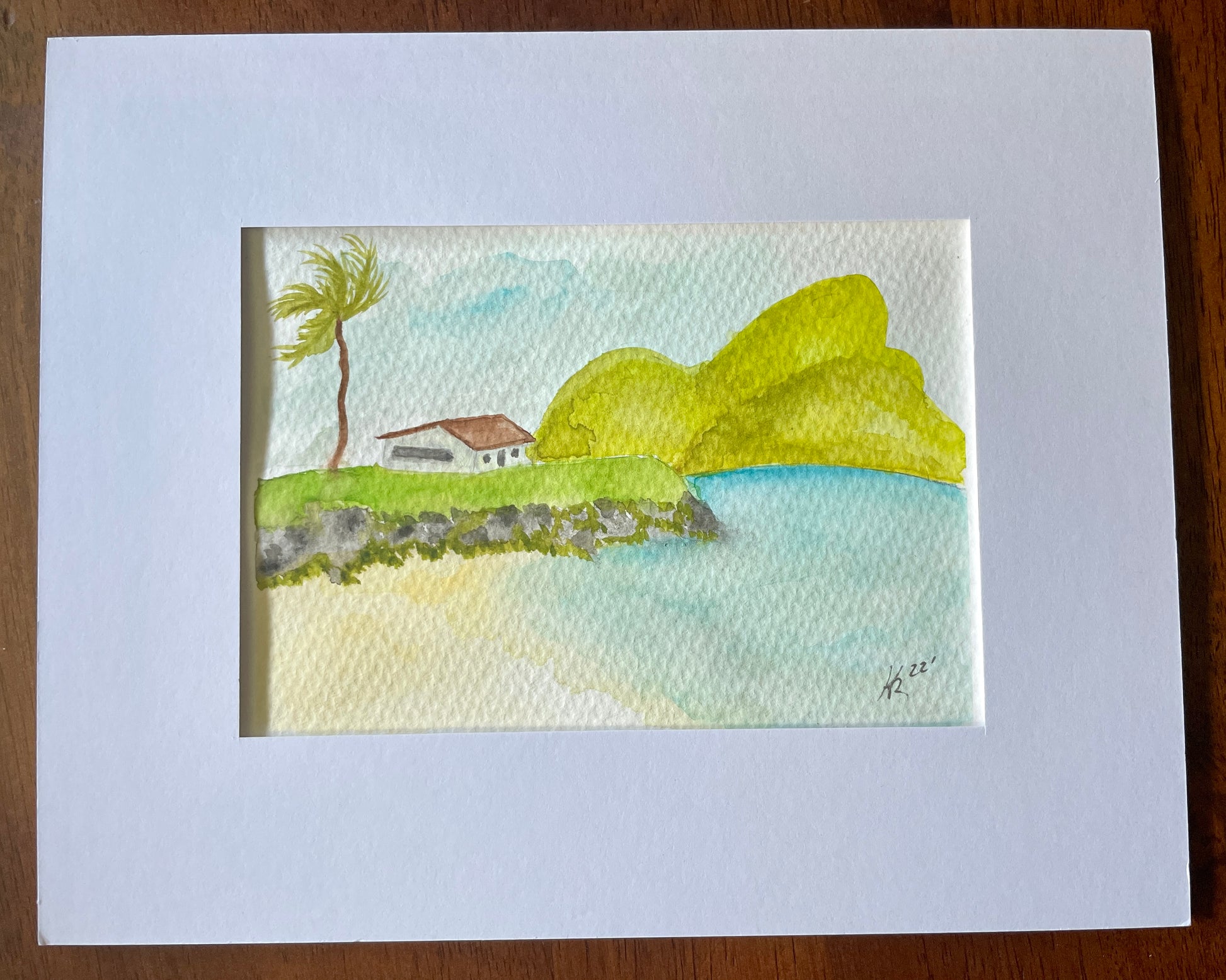 This private military beach at Bellows AFB on Oahu has cabins for the military members to stay at. This watercolor depicts the last cabin on the beach property.