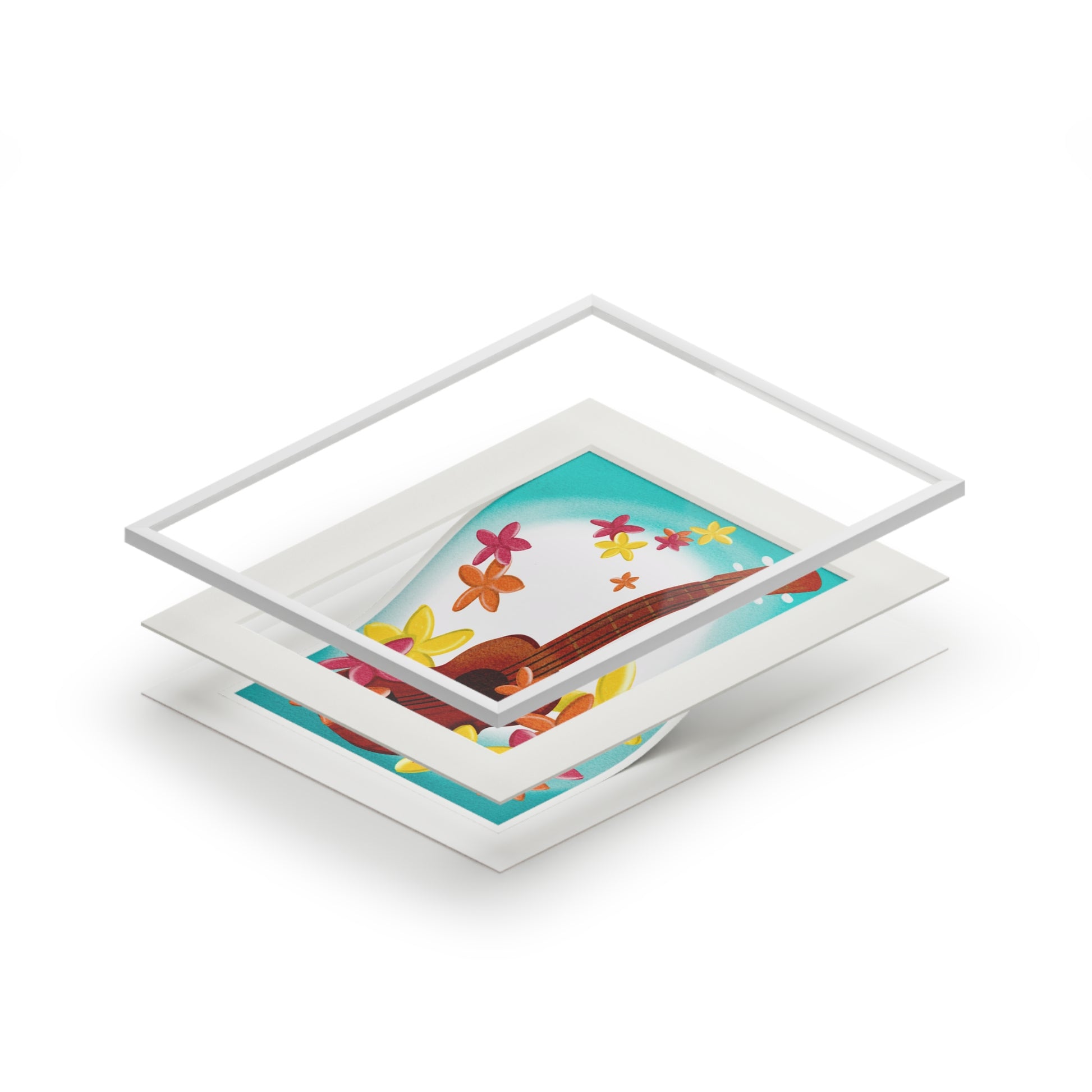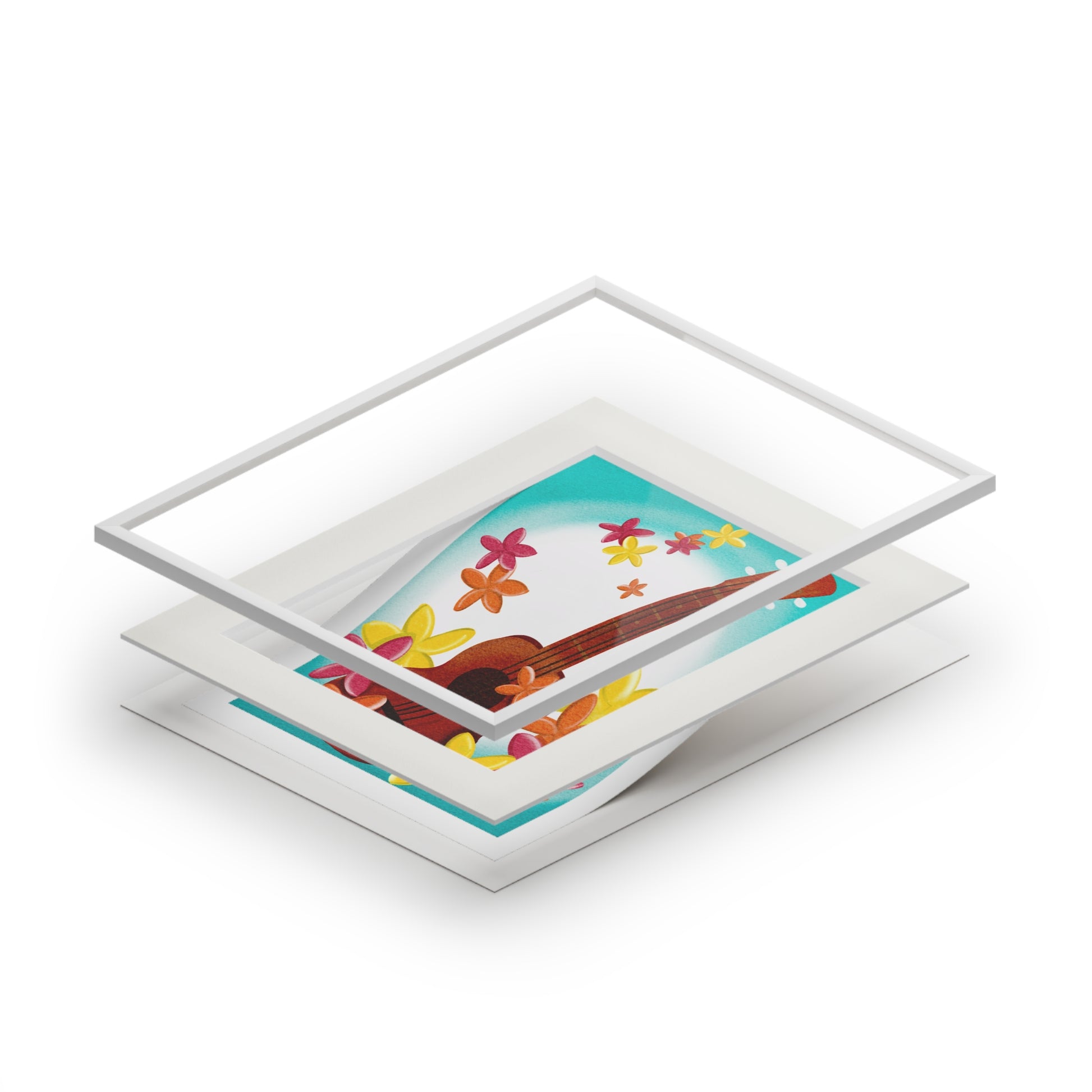 Ukulele Dreams 11x14" is printed on fine-art paper prints. Equipped with a thick, 2mm (0.07") and mat paper frame in a natural white color, these prints can be hung as-is or inserted in a protective frame of your choice.