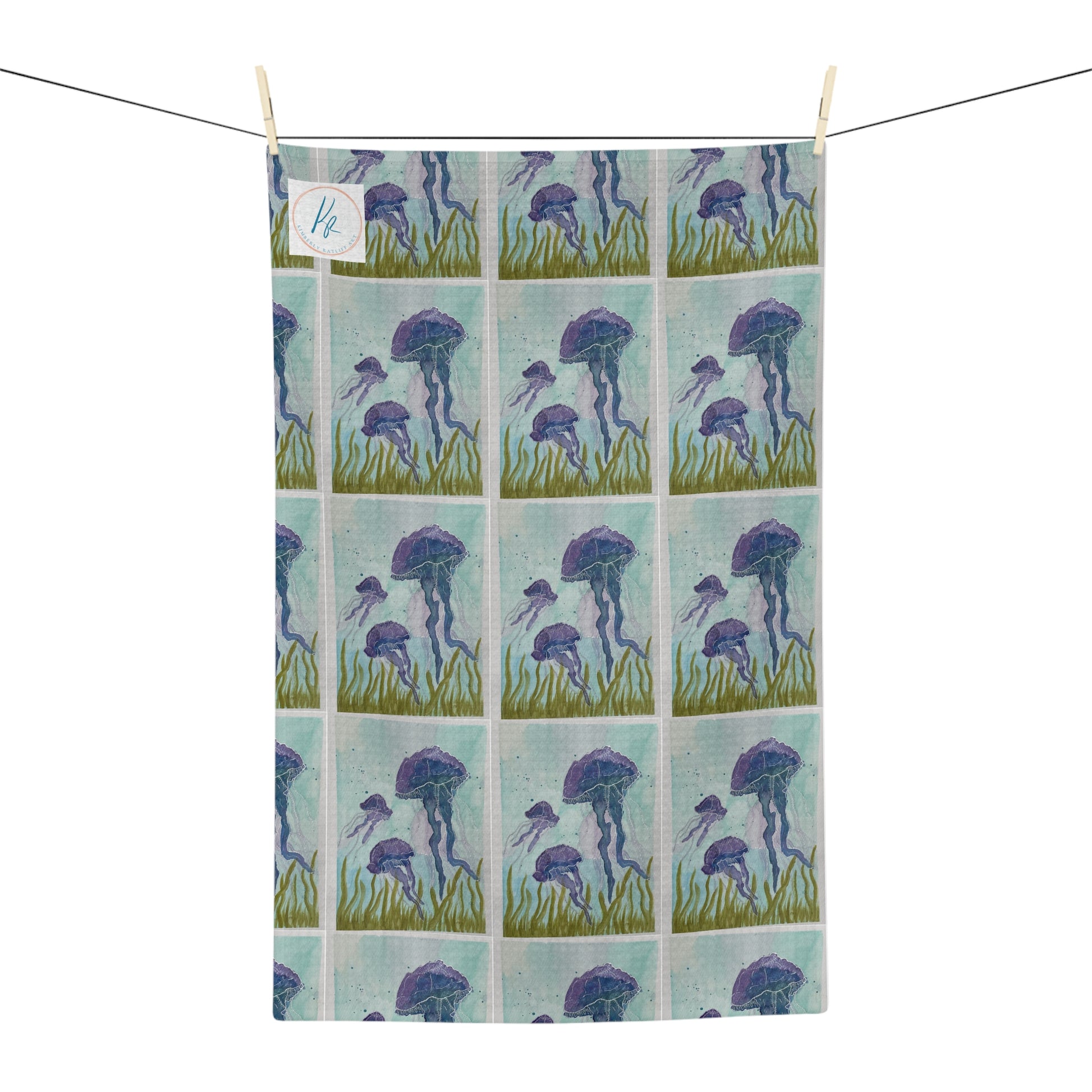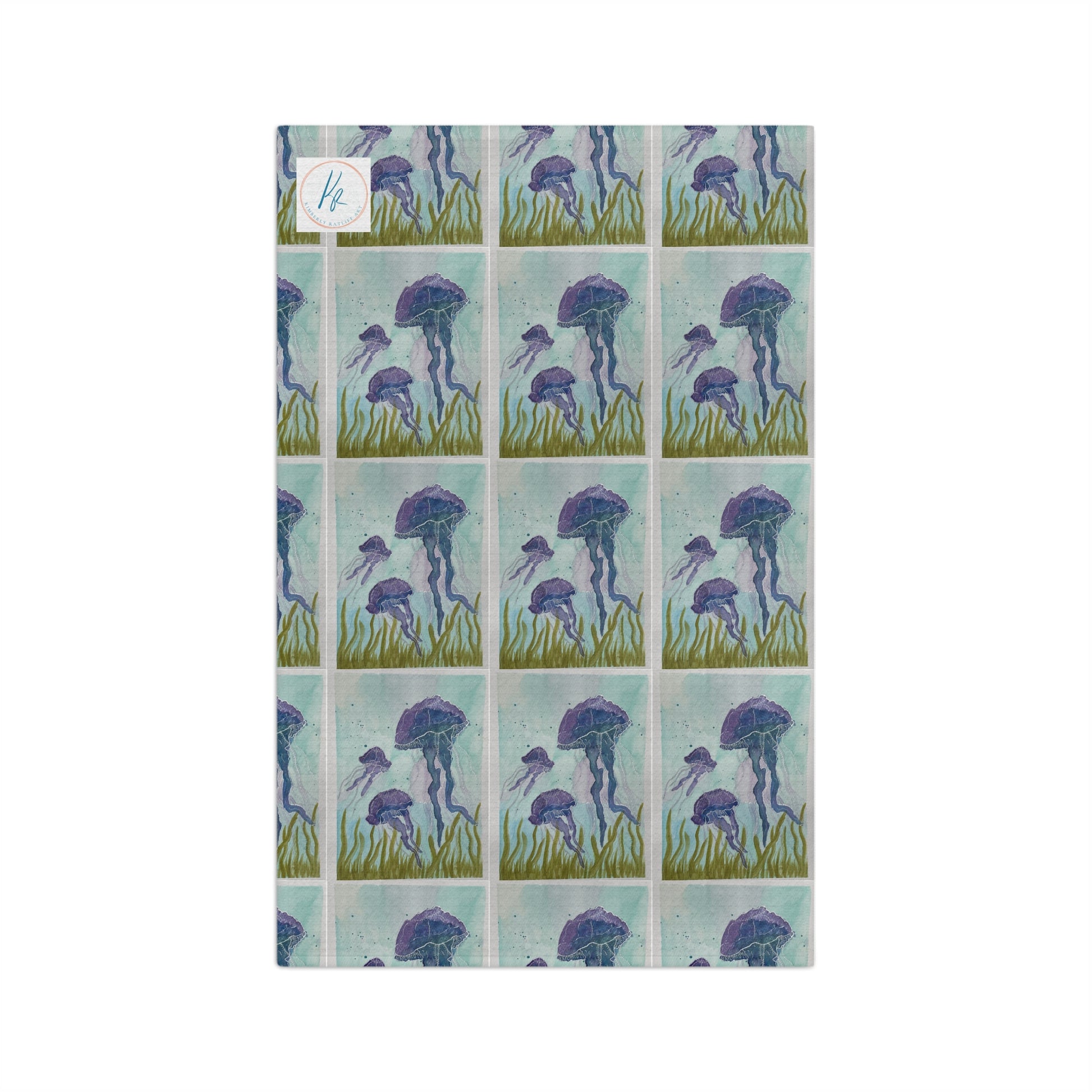 Whimsical and beautiful blue and purple jellyfish design on a soft tea towel. This tea towel gives a calming and oceanic vibe, perfect for adding a touch of whimsy to any kitchen. Ideal for those who love sea creatures and want to bring some charm to their cooking space. Relevant for coastal-themed decor, beach lovers, and ocean enthusiasts. Great for gifting on birthdays, housewarmings, or beach-themed parties.