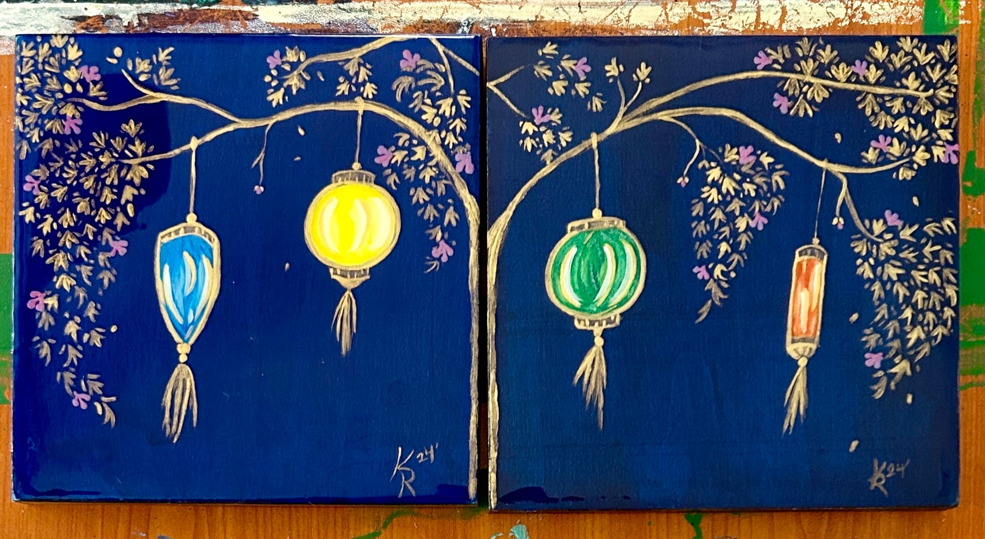 Blue with Blue, Yellow, Green and Orange lanterns hanging from golden and metallic purple tree.