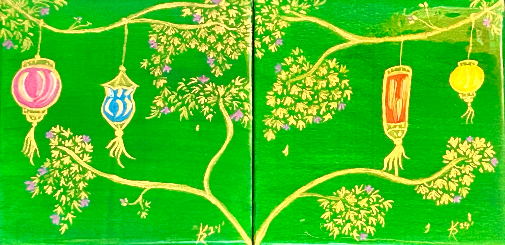 Green with pink, orange, blue and yellow lanterns hanging from golden and metallic trees with pink flowers.