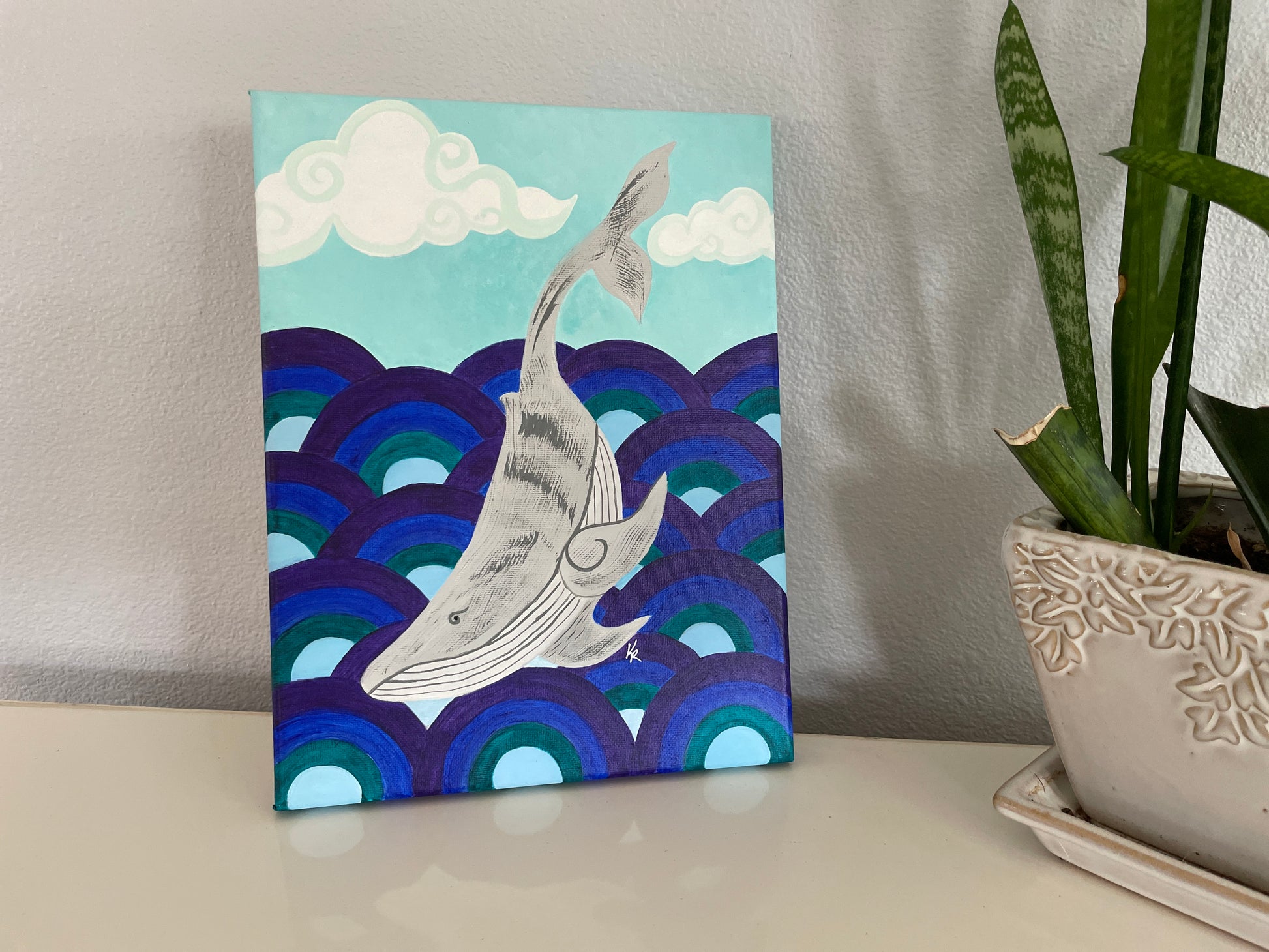 This piece is inspired by the beautiful humpback whales of Hawaii, asian block printing and asian styles of illustrations.