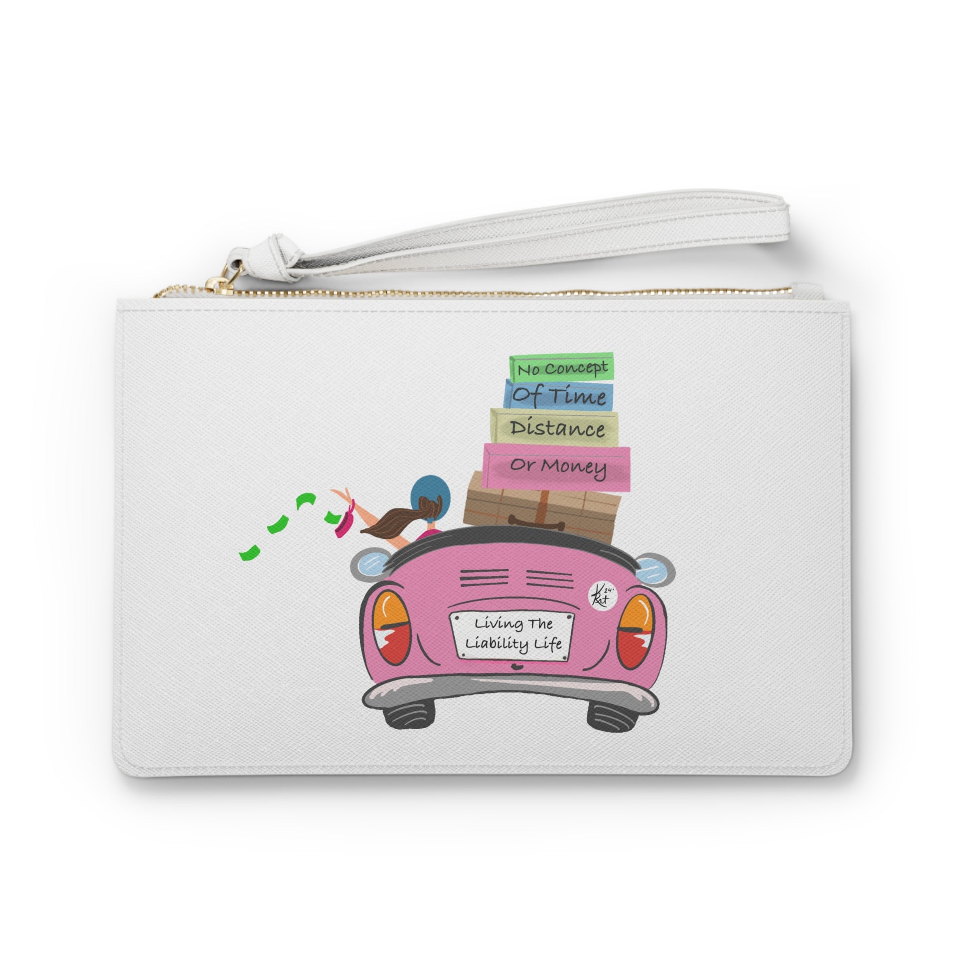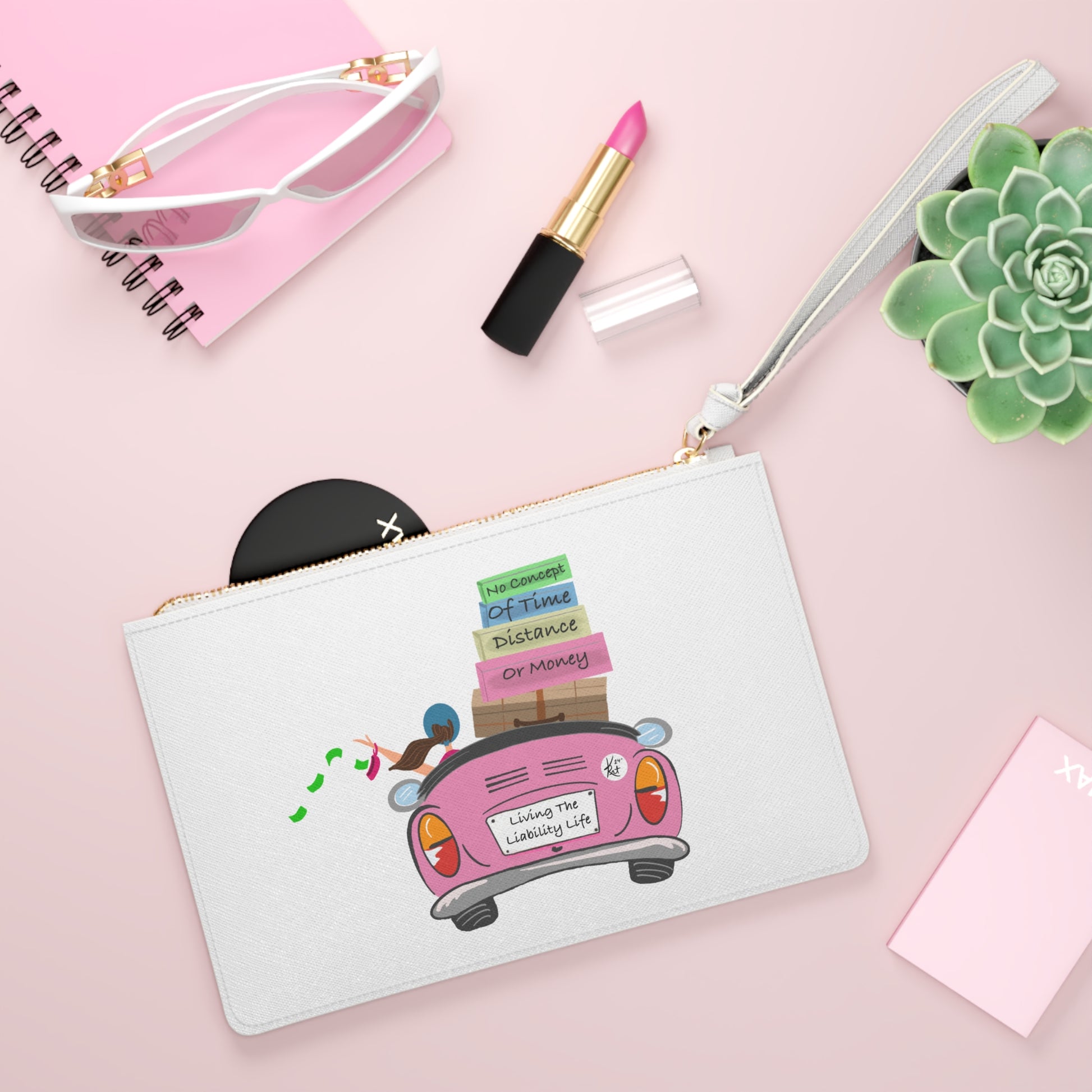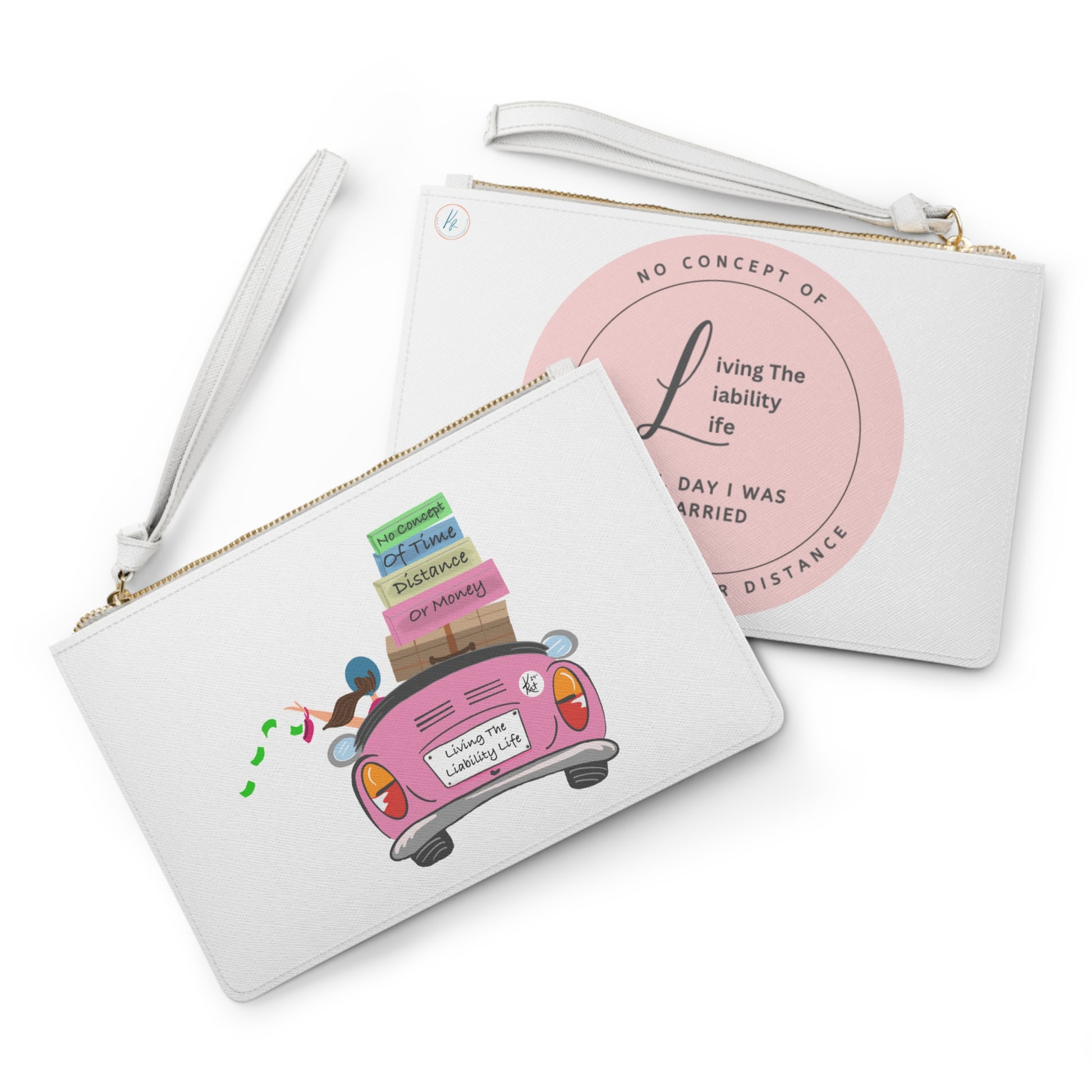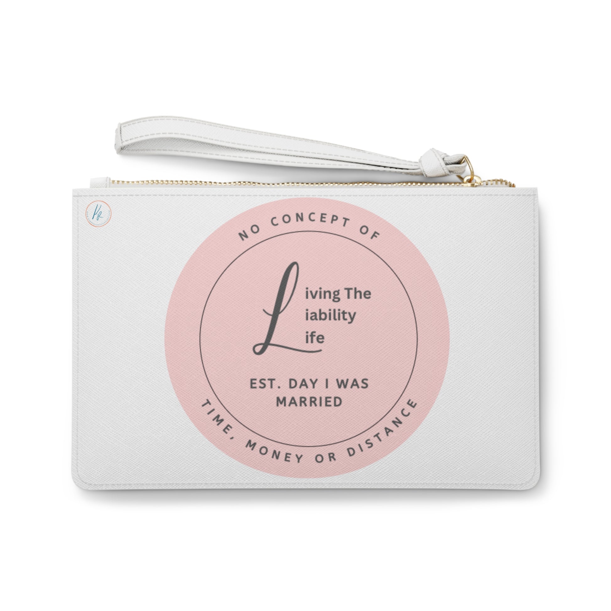 Living the Liability Life clutch bag designed for the fashionista on the go. It is perfect for holding everyday essentials such as a phone, wallet, and keys. The clutch bag features a zip fastening and a fully lined internal pocket, made of vegan leather in the Saffiano pattern finish. This stylish and practical accessory is relevant for fashion-forward individuals looking for a unique statement piece.