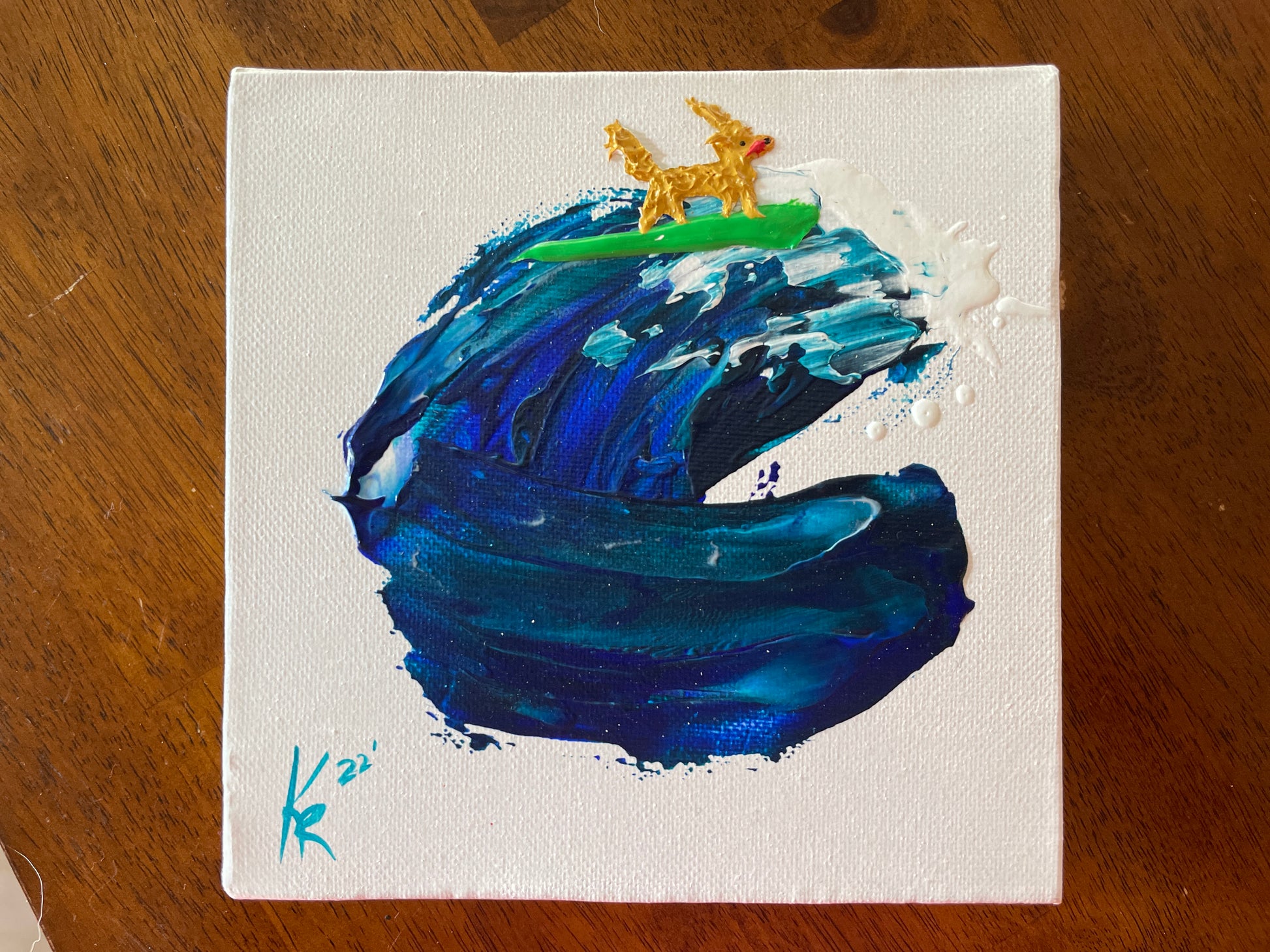 6x6x1” quality acrylic on wood canvas with dark stained sides. Surf Pets adds fun to any room and a fun way to memorialize your favorite furbaby!
