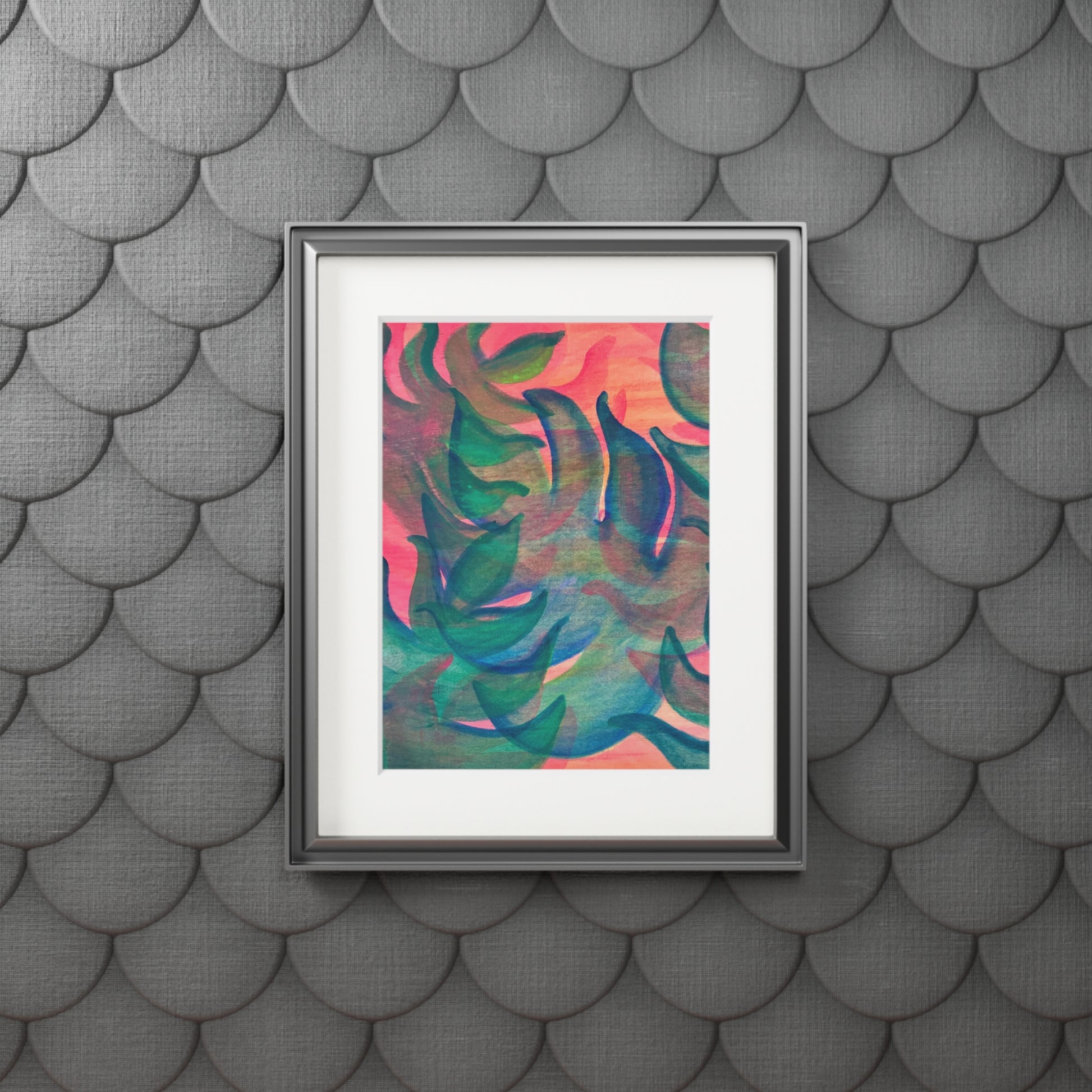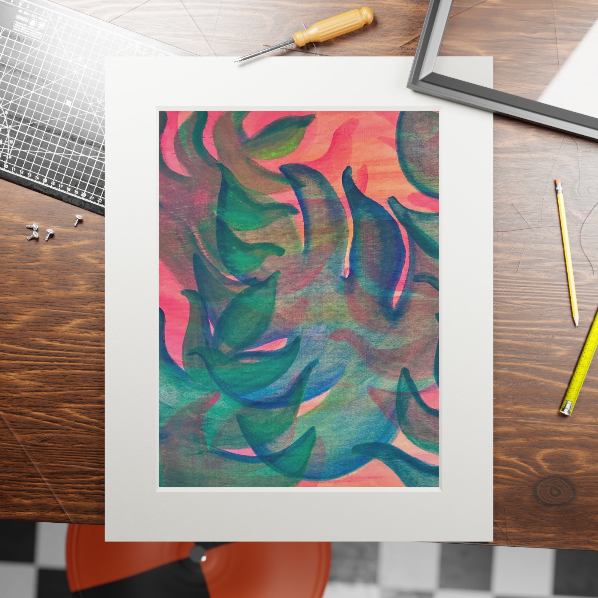 Brighten your space with a pop of color and whimsy with this cute, layered monstera pattern print. It is complimented by a mat, perfect for adding a touch of tropical charm to your home decor. This print is relevant to those who love colorful and fun art pieces, and it is perfect for adding a splash of personality to any room. Ideal for summer decor, tropical-themed parties, or as a gift for pineapple enthusiasts.