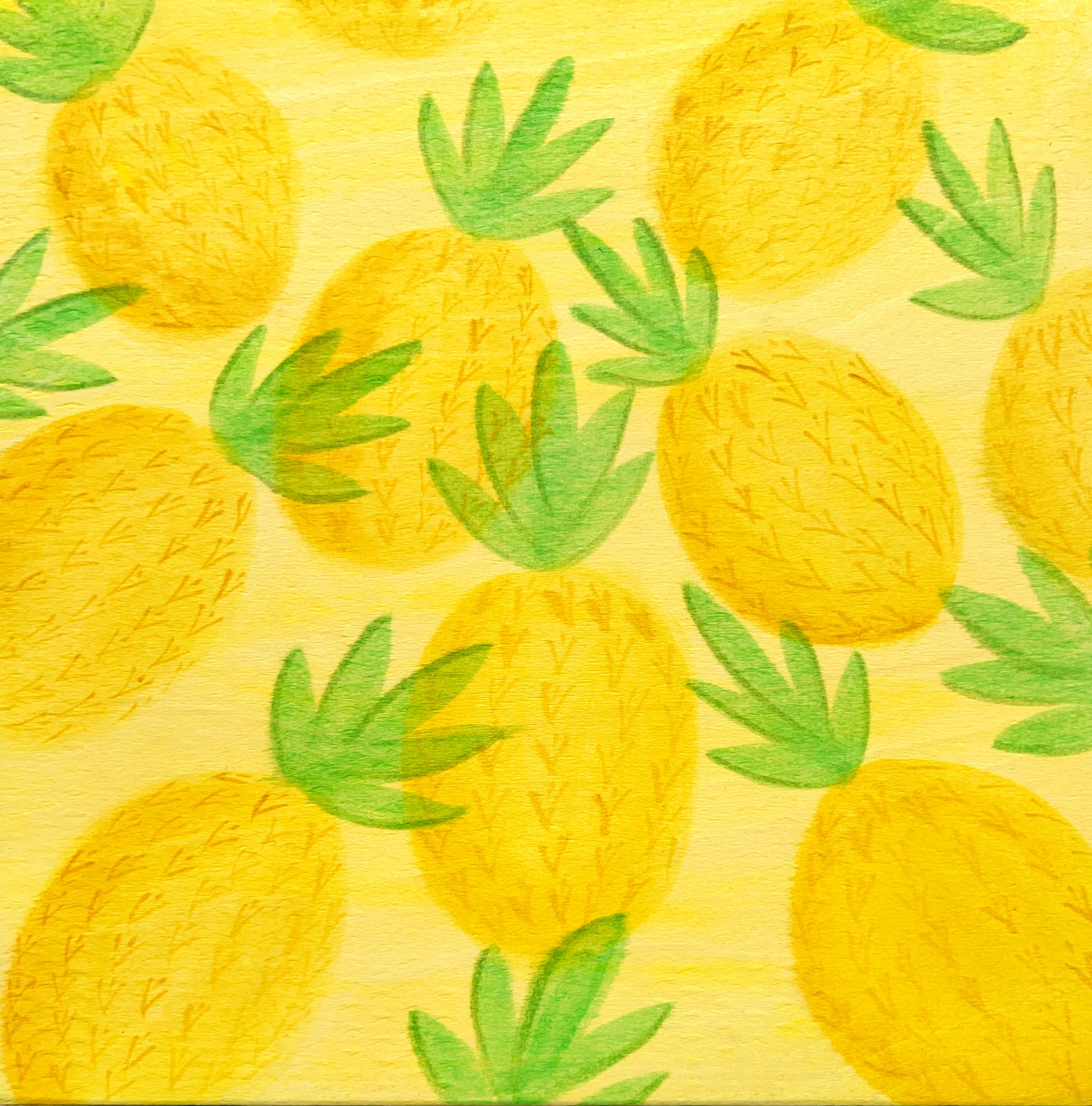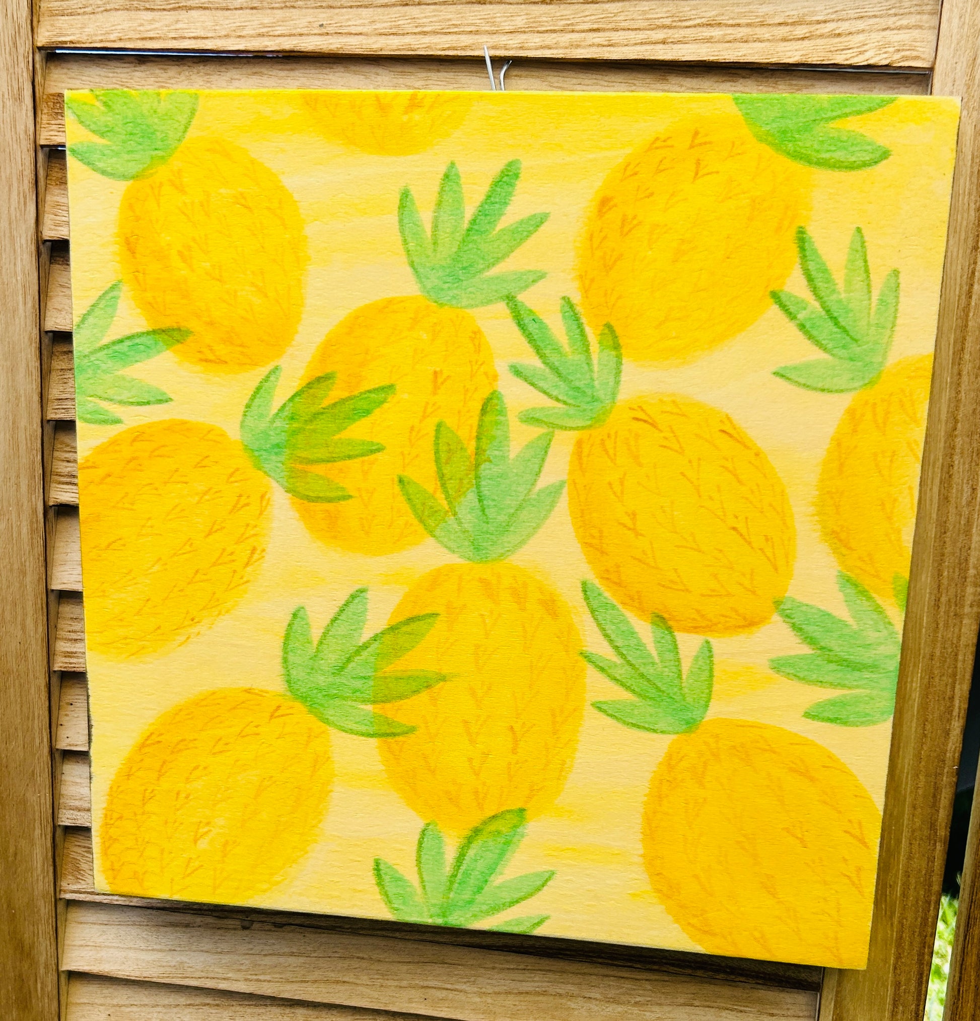 These bright pineapple fenzy will brighten any area of your living space you'd like to add color and a focus of interest. This is 12x12" on wood canvas. The sides are stained a dark brown.