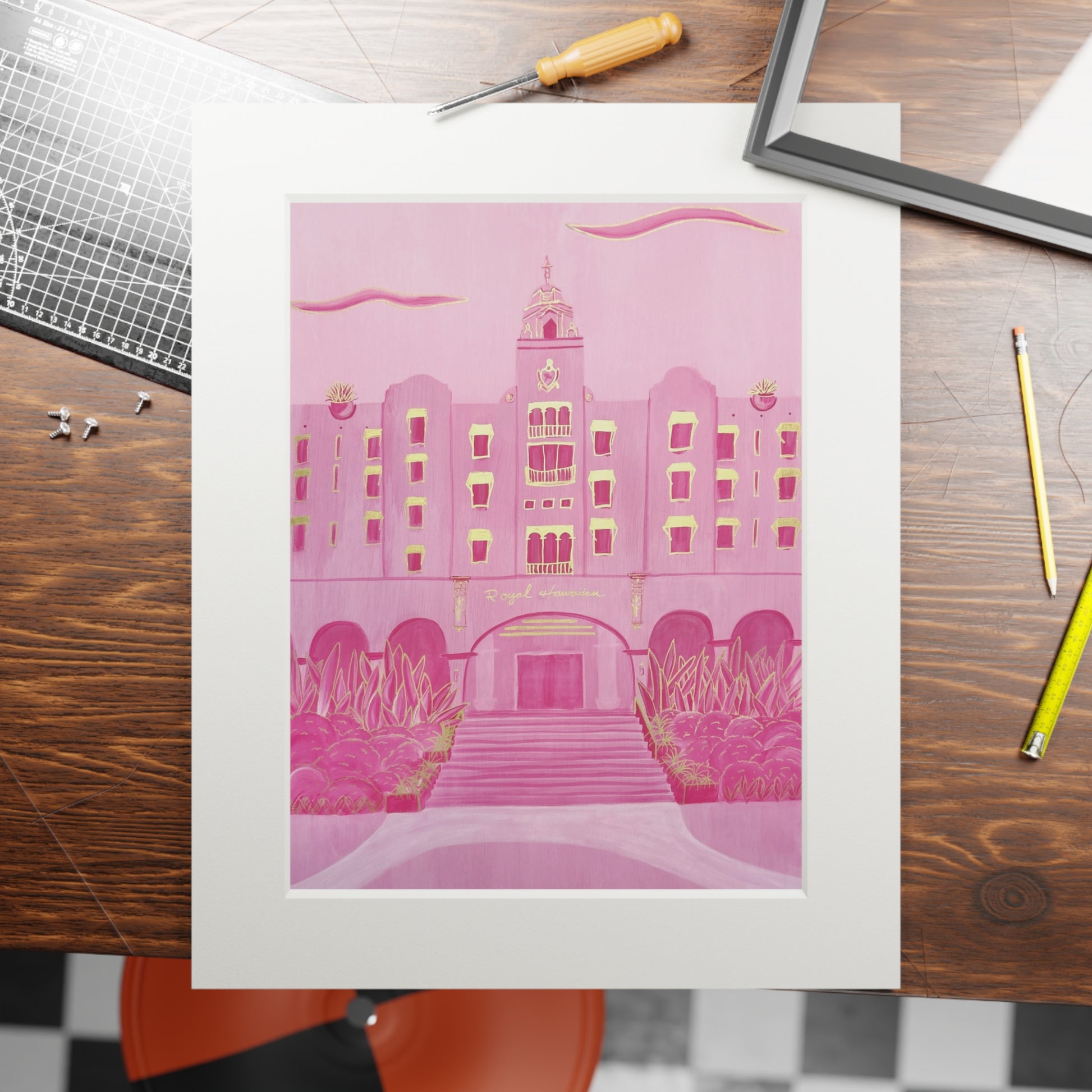 The Royal Hawaiian Hote watercolor giclee is printed on fine-art paper prints 2mm (0.07") and mat paper frame in a natural white color, these prints can be hung as-is or inserted in a protective frame of your choice.