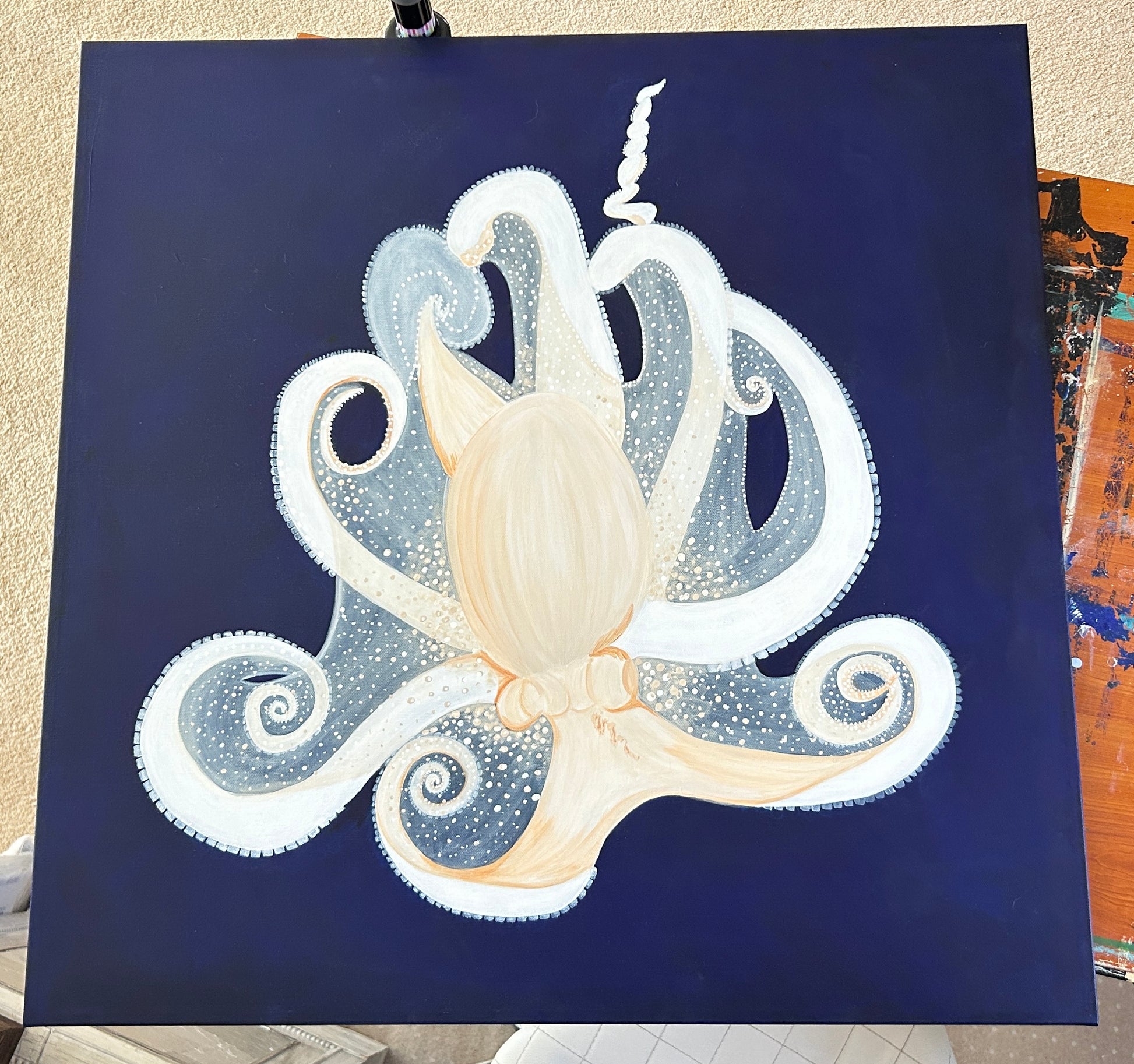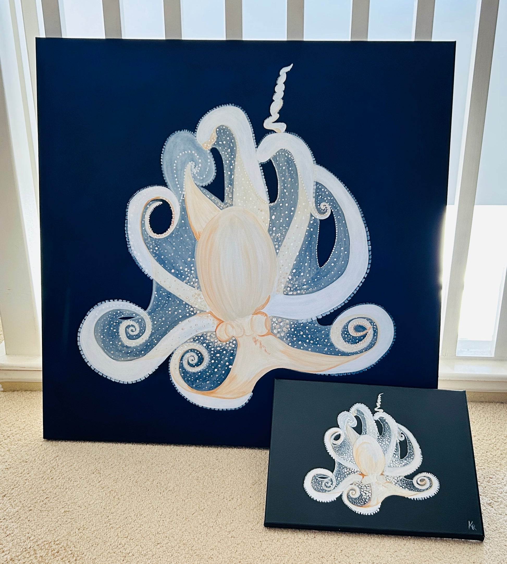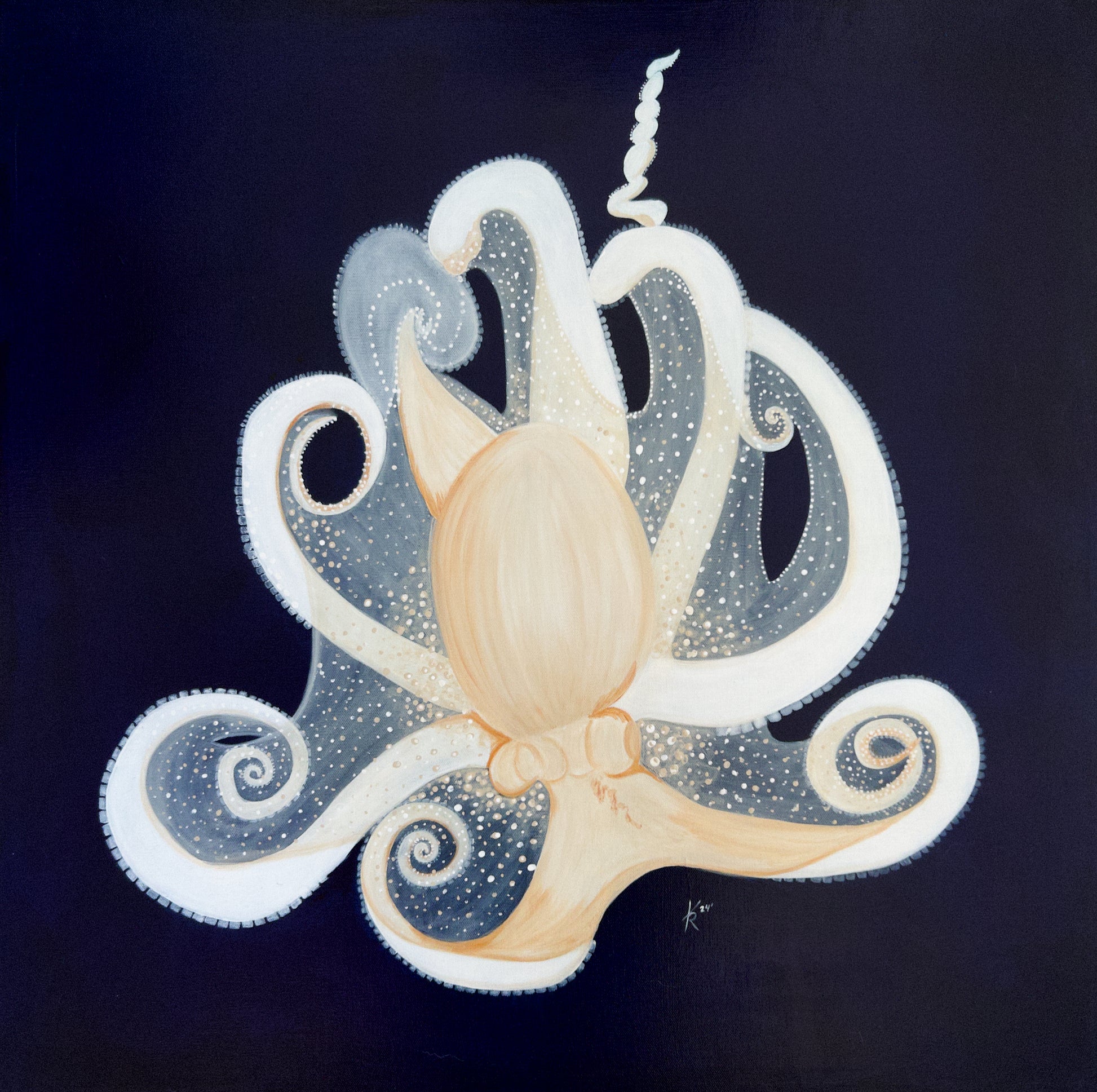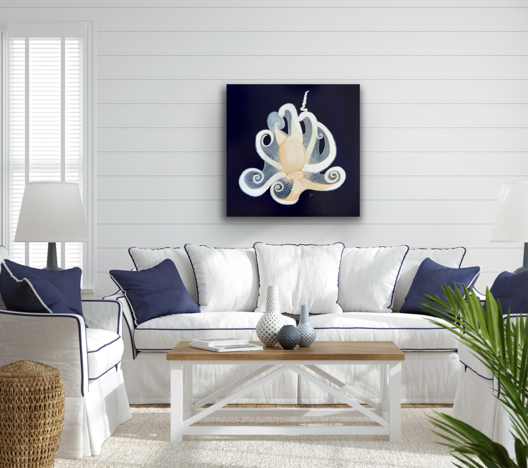 “White Octopus” portrait on deep night blue, 30”x30” canvas. Makes a dramatic and lux look in any formal setting with her dramatic contrast and elegance.